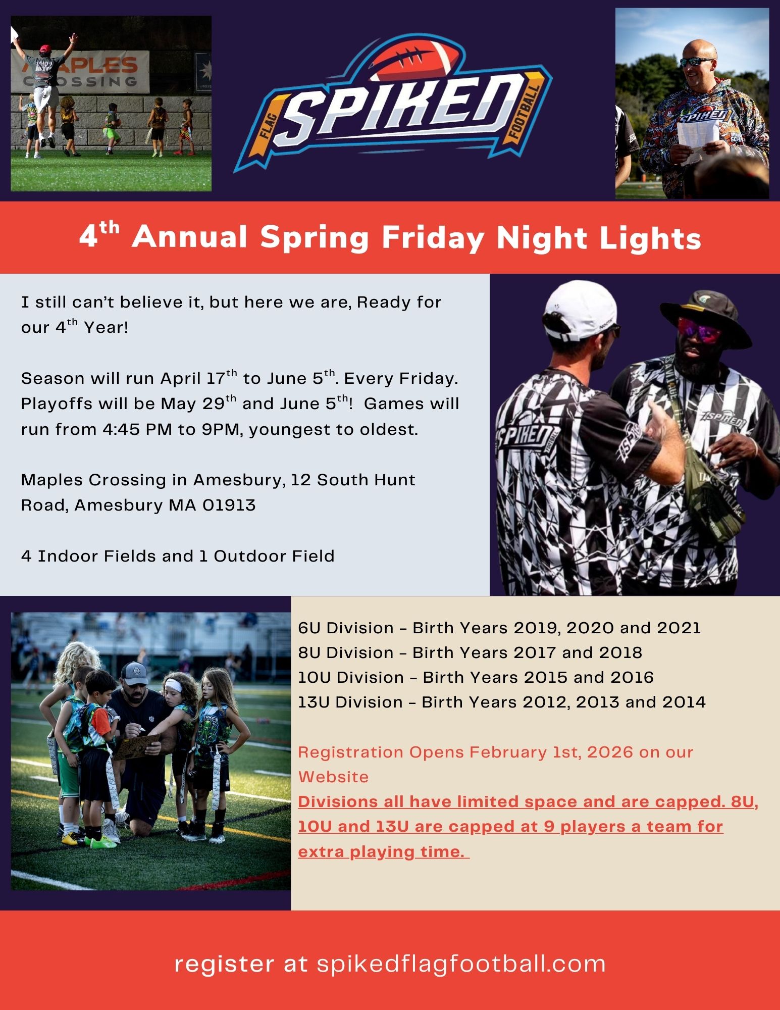 This is Spiked Flag Footballs 4th Annual Friday Night Lights Spring Season at Maples Crossing in Amesbury. The league will open this year on Friday April 17th, 2026, and playoffs will conclude on June 5th, 2026.